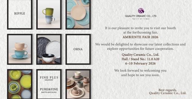 2025/02/04 AMBIENTE FRANKFURT FAIR 2025 AMBIENTE FRANKFURT FAIR 2025 Quality Ceramic Co., Ltd. invites you to Ambiente 2025. Frankfurt am Main Hall 11.0 Stand No. A20 07 – 11 .02 . 2025 Read more